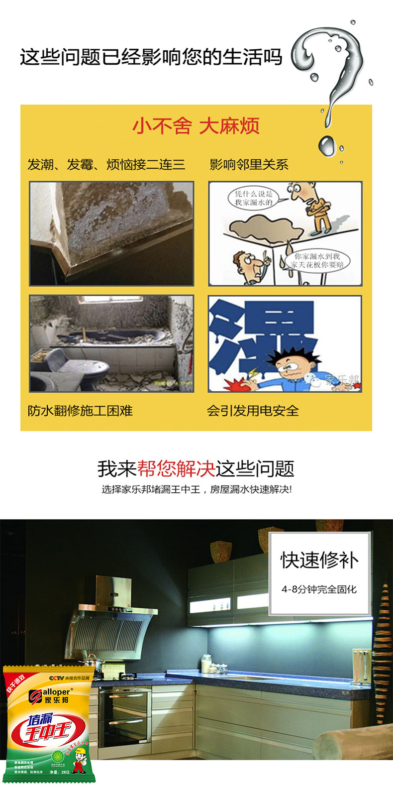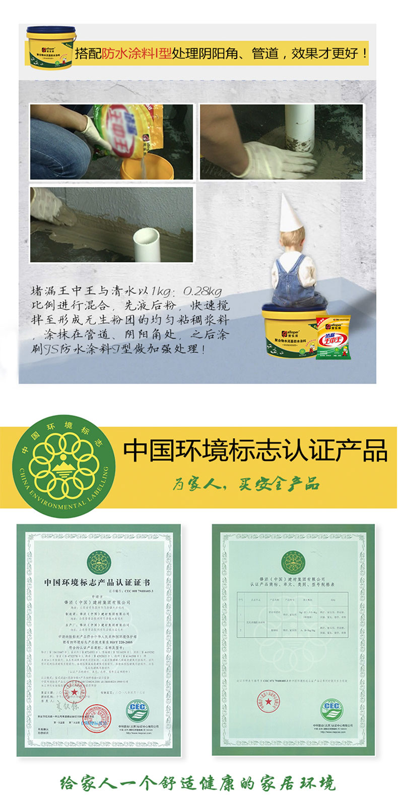 評價:東西很好,本來馬桶下水管總有水沿著管子滴到樓下,把馬桶拿了,下水管旁邊的地磚切了,砂漿全部清掉,用堵漏王中王沿著馬桶管堆一圈,再用防水涂料涂了兩遍,最后用剩下的堵漏王中王混了點沙子把地面找平,馬桶按上去。過兩天樓下一看,滴水不漏!