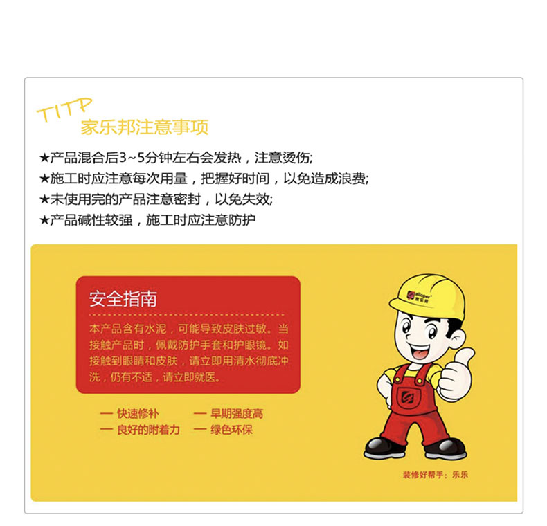 評價:首先感謝快遞小哥能快速安全送到,感謝家樂邦提供的極好產品服務!比較了幾家,看重網友好評,優選此家。施工時先放水,家用小碗大概兩碗的量,然后加水泥快速攪拌,此款水泥干得快,要少量多次的使用。效果很好,由于質價比高,自來水一名,各位可放心選購。最后愿小哥身體健康,工作順意;祝商家生意興隆,大家多多支持。