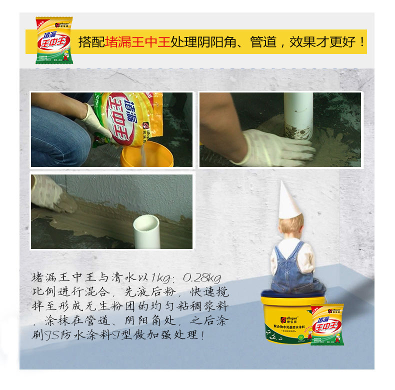 收貨28天后追加:上次買了用了效果非常好,我用的水泥是2公斤的防水的小包裝,用后效果很好,因為水泥還有一半,所以再買了一遍家樂邦防水涂料。