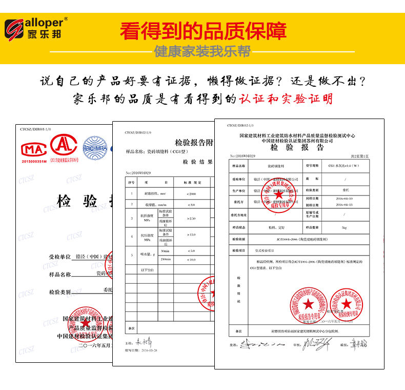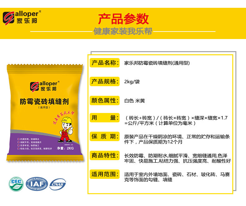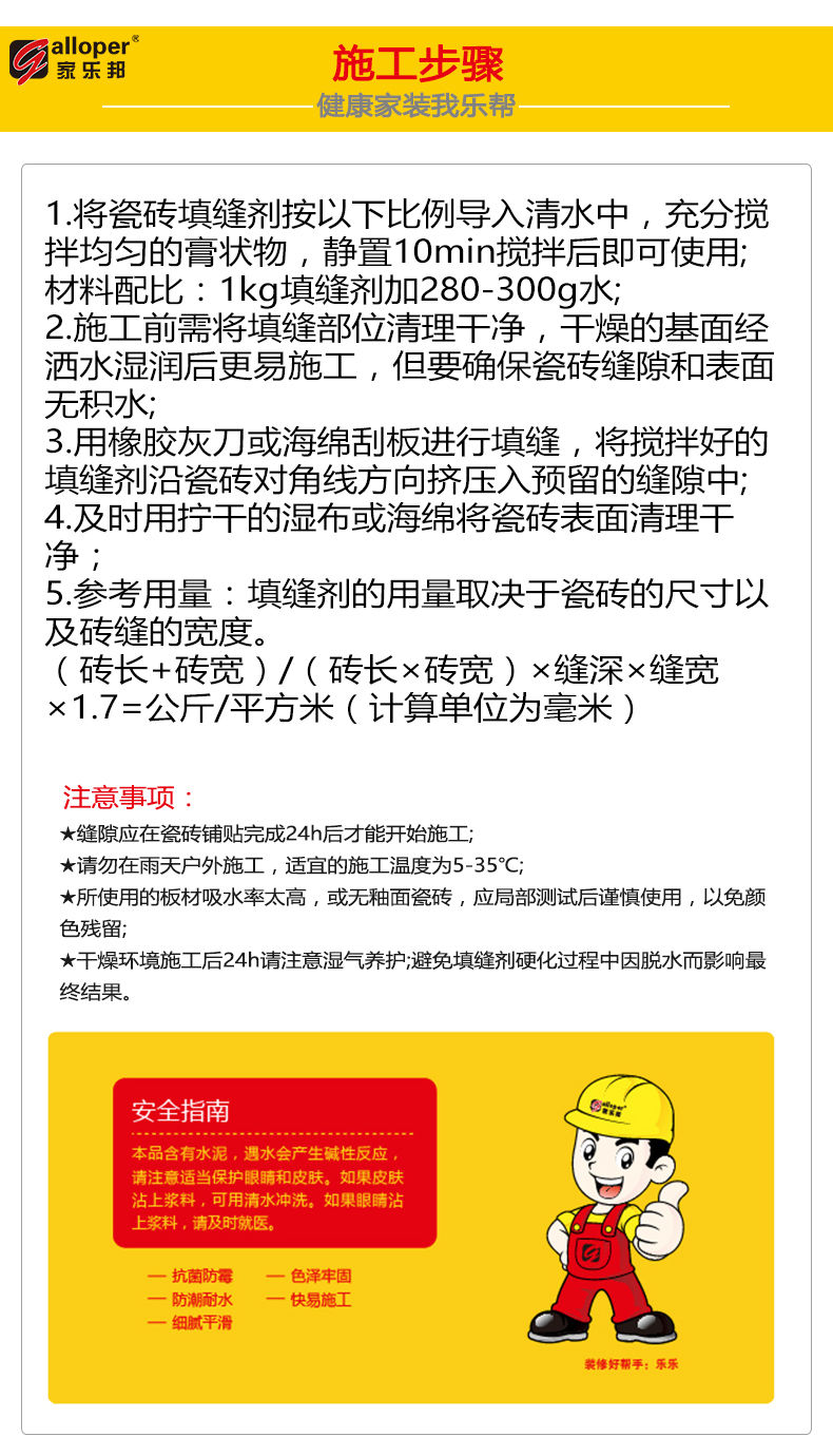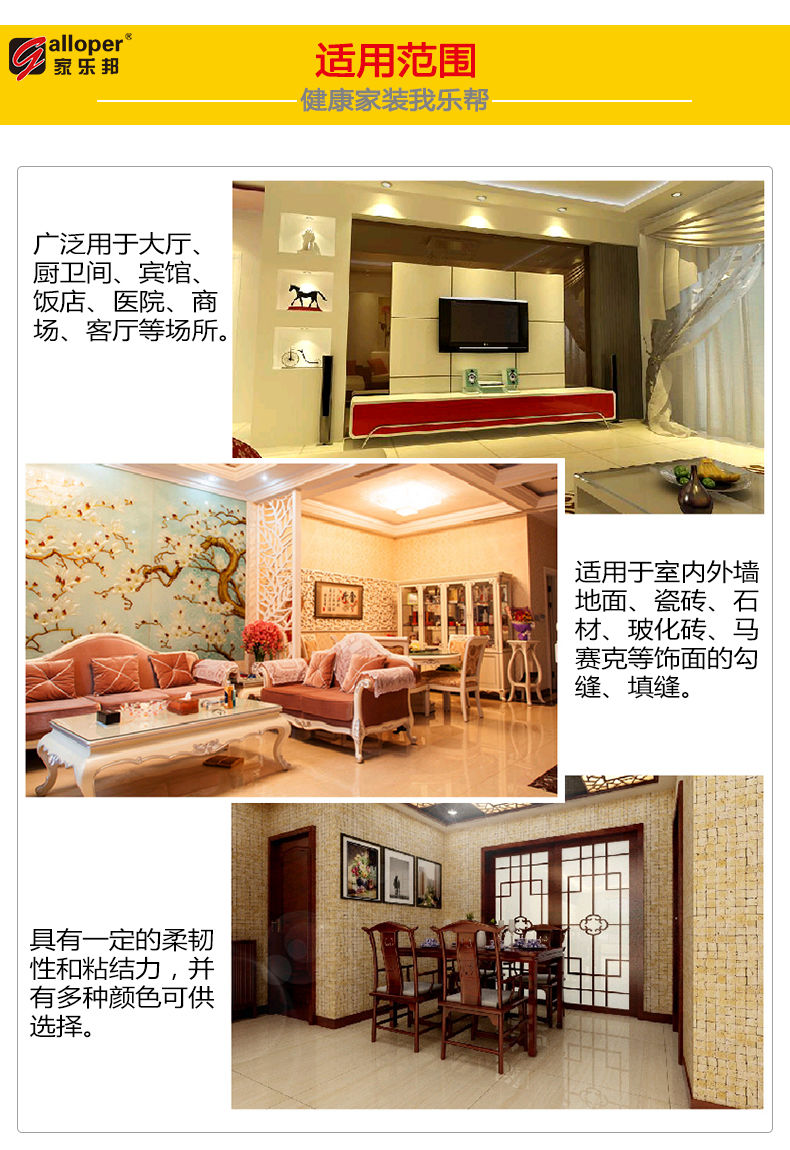 解釋:家樂邦有自己的2個大型工廠,自己的研發團隊 對于產品我們是認真的,當然還有服務~【家樂邦官方旗艦店】是面向家庭裝修領域推出的多元化品牌,品牌產品涵蓋了家庭裝修中需要用到的膠粘密封、防水材料、油漆涂料、干粉砂漿等不同裝修輔料類產品幾十余種,產品的推出填補了家裝輔材類品牌的空白,使得消費者無需為市面上種類繁多單一的產品犯愁,再次感謝您對家樂邦的支持